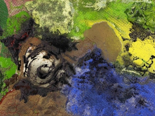 Between monumental paintings and wooden sculpture, Philippe Pastor’s experiment develops into a myriad of underground perspectives that transcend the ephemeral aspects of today’s fad-driven society. It opens up a reflection on the issues of community and the environment, without neglecting either the endogenous relationship with Nature or the symbolic interpretation of things. The large panels that Pastor is making for the Monaco Pavilion recreate some kind of scene from the cosmic drama, entitled “The Sky is Watching the Earth”. Similar to satellite images of Earth, these scenes, arranged as if in three acts, turn our eyes to a type of chaos, both human and natural, divided into several thematic frames: Nature, the North Pole, and Pollution. The panels refer respectively to the “North Pole”, the “Cyclones” and “Disfigured Nature”. (…)
